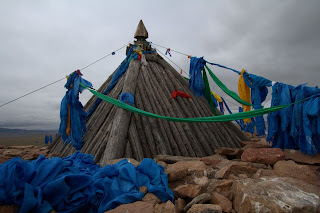Today I walked to the awaa with a relative of the family. Three hours round trip. The awaa has a significant place in Arbulag lore. B's mother typed it up as part of her job for the school children. She shows it to me. Three hundred years ago a Mongolian hero warrior was fighting against the Chinese. He knew he would be captured, so he cut off his thumb and put it on the mountain. He was brought to Beijing and killed in a peculiar manner: 81 coins with holes in their centers were placed on his body and through each hole a vein was pulled and pierced.